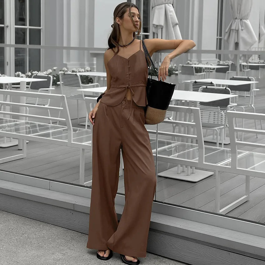 Elegant Summer Two-Piece Set – Strap Vest & High-Waist Wide-Leg Pants