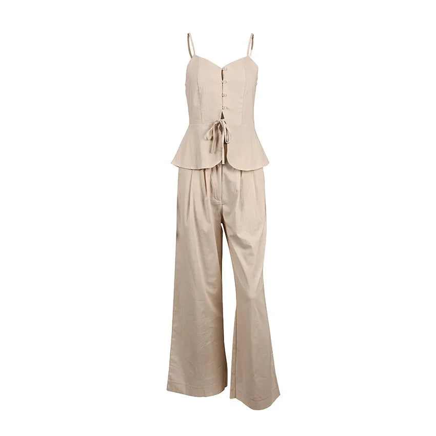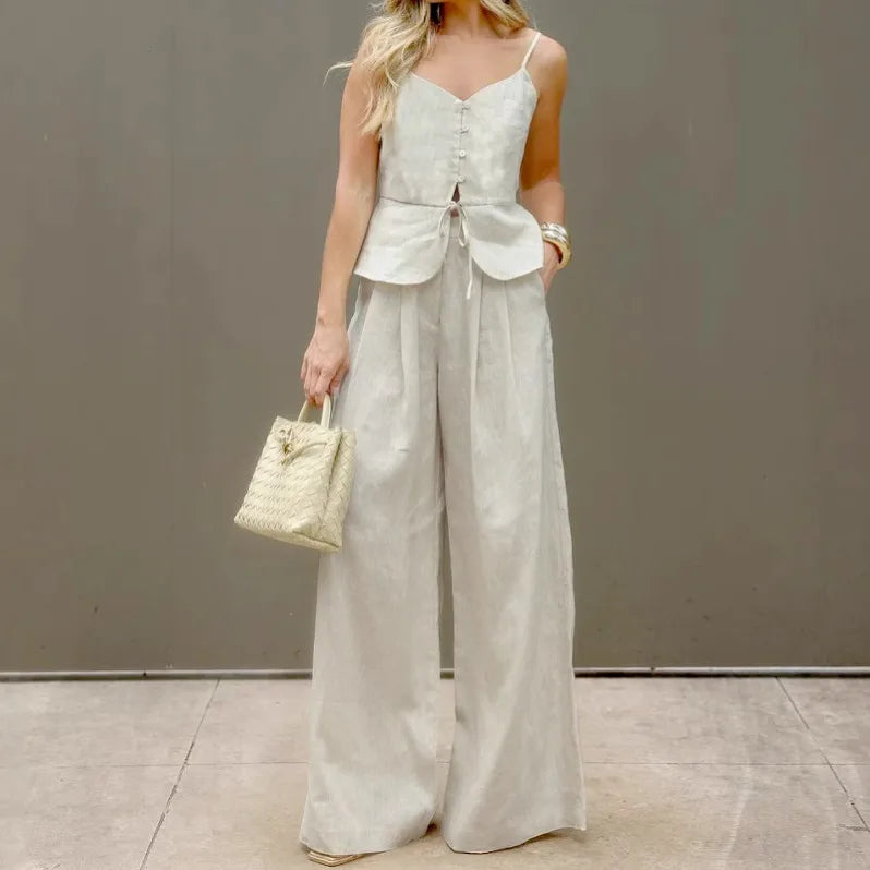 Embrace effortless elegance this summer with our two-piece set, featuring a strappy vest top and high-waist wide-leg pants. Made from a soft cotton blend, this outfit combines comfort and sophistication for your daily looks.
